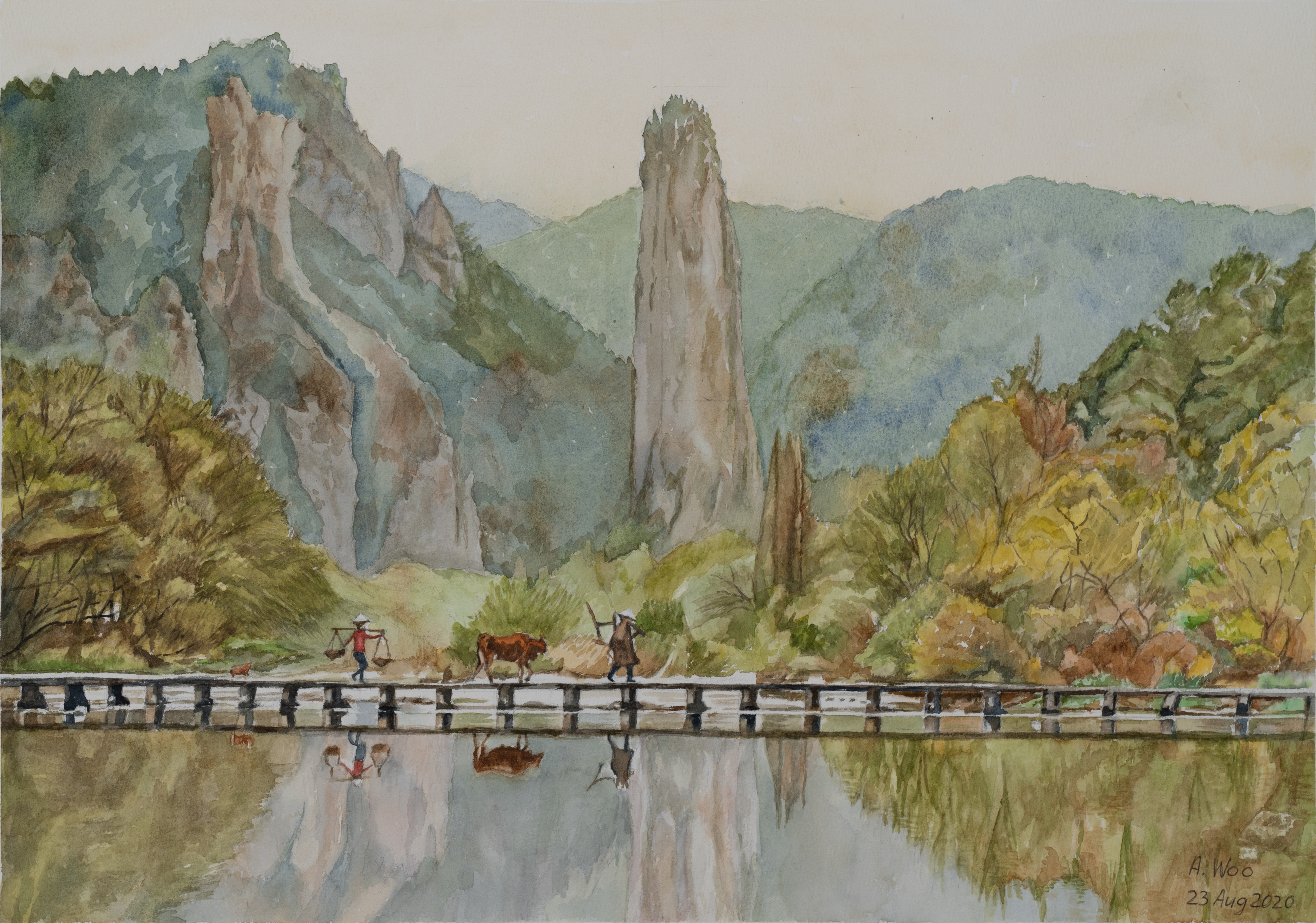I like this piece of work for the opportunity to show reflections in the water of everything that is above the bridge. The horizontal reflection line has to be drawn correctly to show realistic symmetry of subjects.