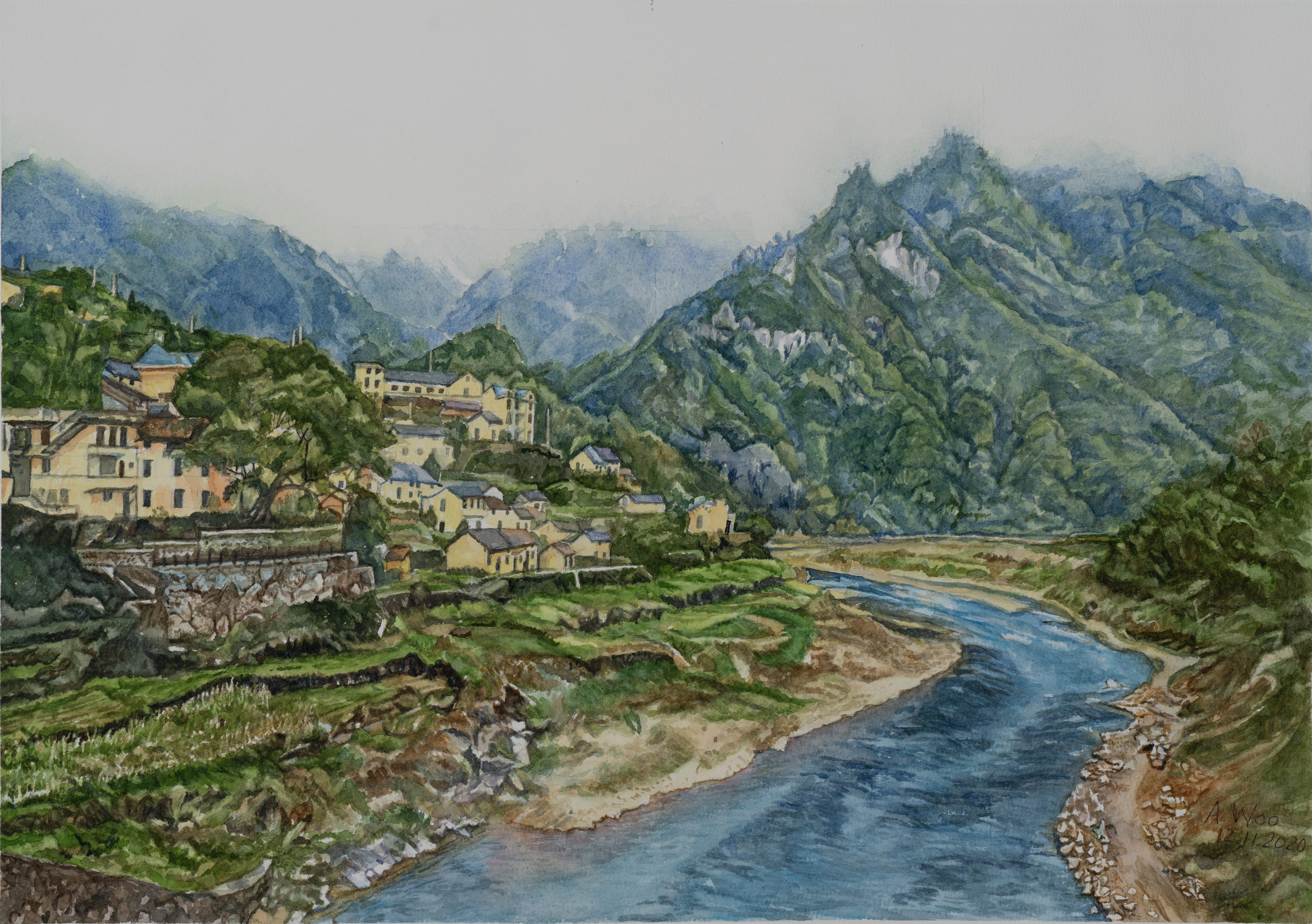 I describe this picture as the Fish Head Village because it is famous for its 焦滩鱼头street restaurants. Its actual name is Jiaotan Village of Jiaotan Township, Suichang, in Zhejiang Province. The Village is located in the upper reaches of Wuxi River from which the fish is harvested for the restaurants. The mountains facing the village houses make a scenic sight with the river.