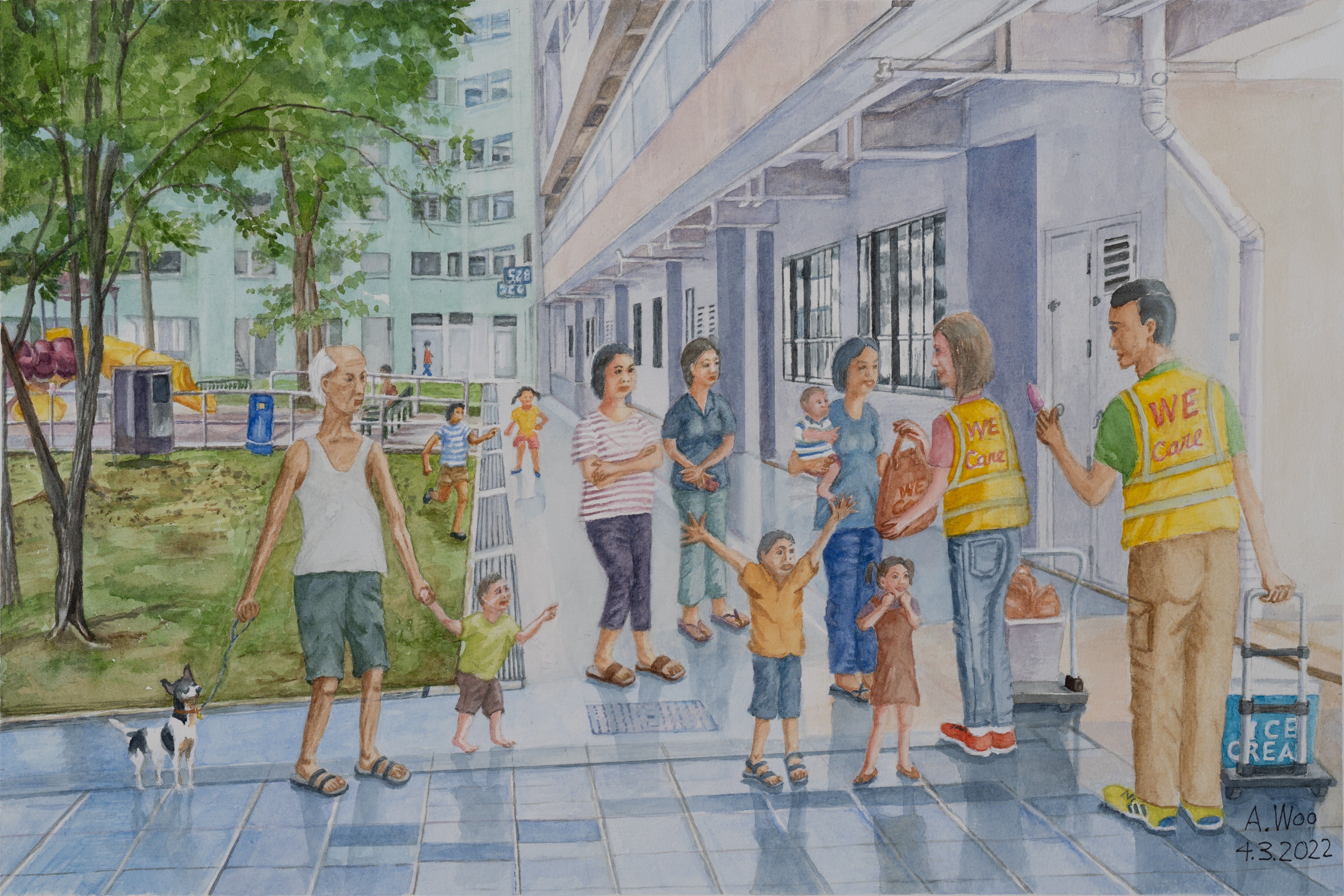 This painting is about arousing the kids’ sense of joy, when things dear to them come from caring people. The children’s experience, even if just once, hopefully will foster a caring society as they become adults. Caring is sharing our own needs with others deprived of the same needs.