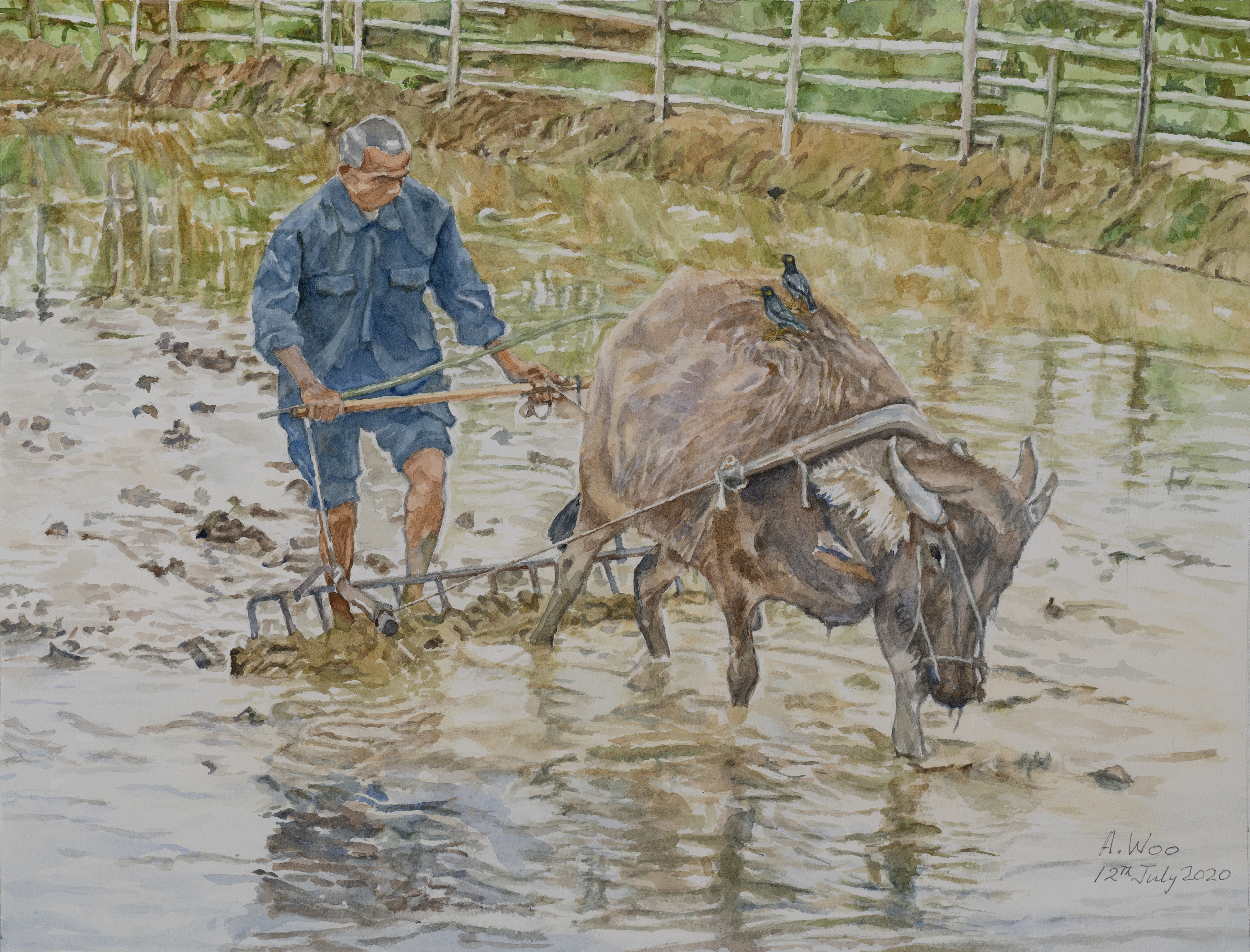 The fun I had out of this painting was in showing reflections in the water and the muddy stains on the legs of the farmer and the buffalo. The farmer had his eyes downcast in concentration whilst the buffalo had a resigned look. The two birds whilst taking a free ride could possibly contribute in picking bugs from the hair of the buffalo.